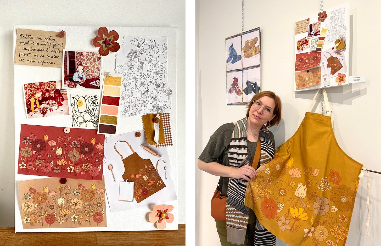 And remember the project from my art class I mentioned in an earlier post, The colour of our memories (La couleur de nos souvenirs)? At the exhibition, held in June, I presented my final result, an apron, printed with a floral design, inspired by the wallpaper from the kitchen of my childhood. I made two aprons and gave one to my mum and the other one I’m keeping for myself (for special, non messy cooking occasions 😊).