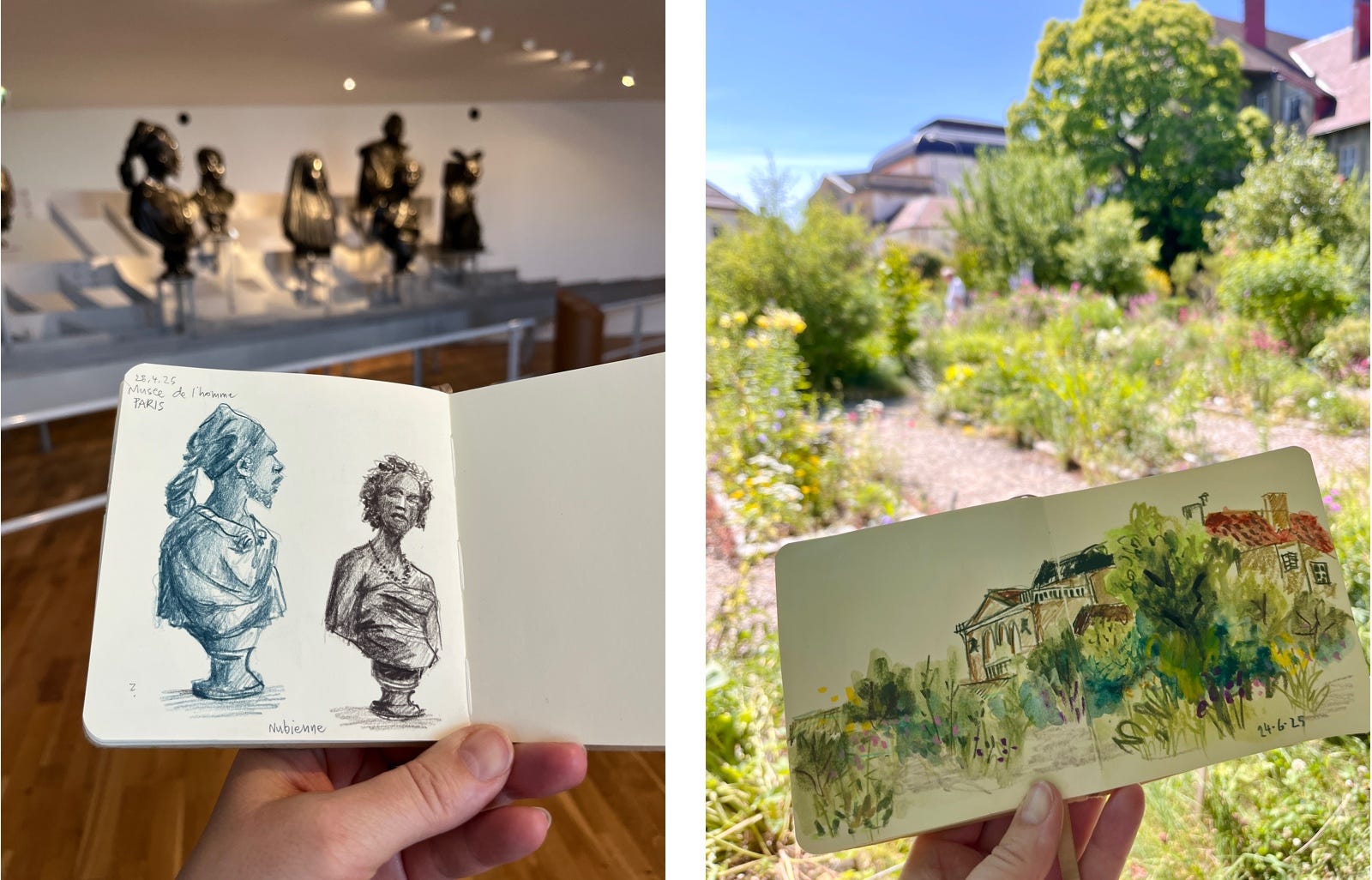 Daily sketchbook practice in the open, urban sketching, travel sketchbook