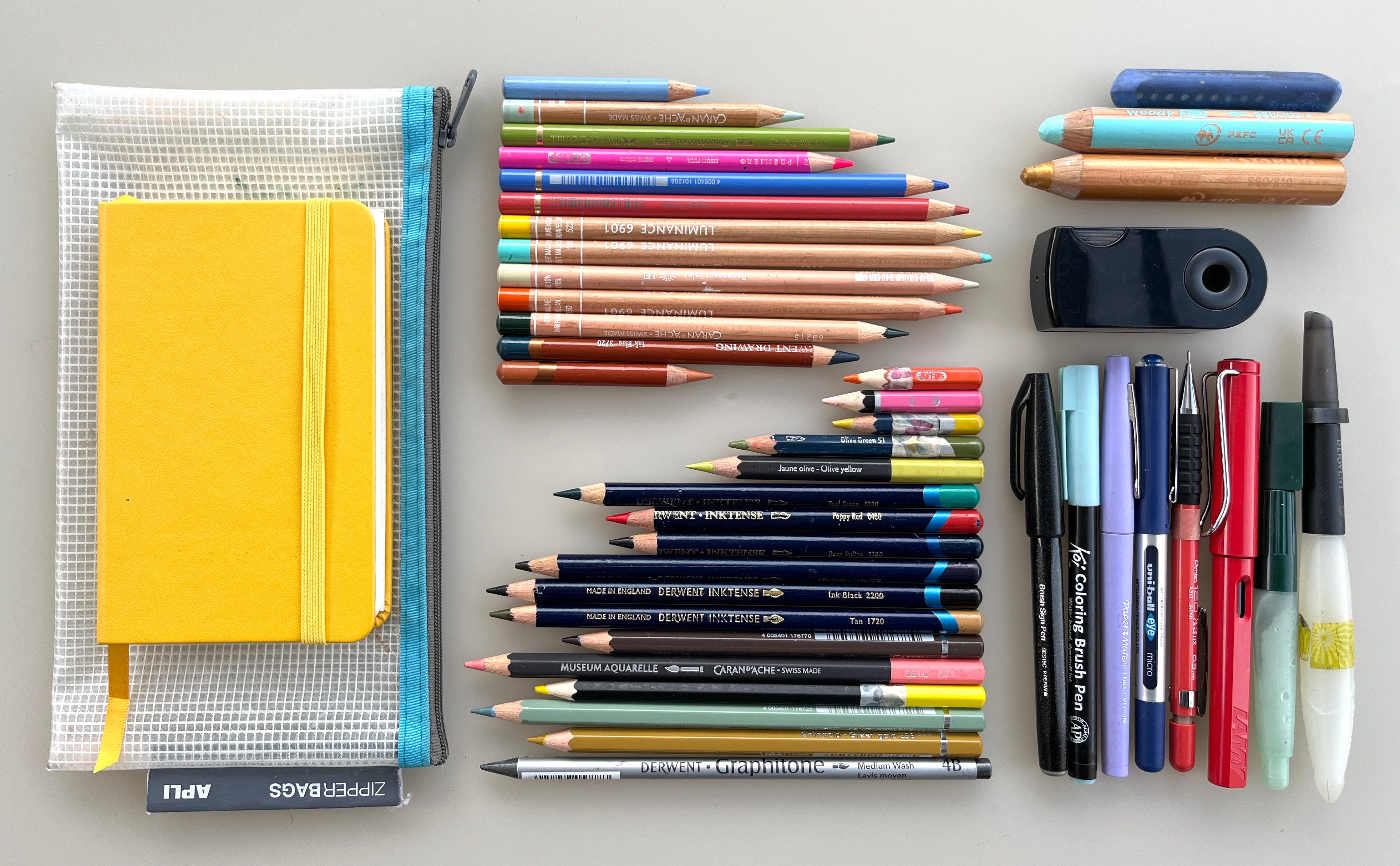 Well, sketching weather is here so I intend to take my sketching supplies with me on my outings, be it to a nearby town, a museum or a park. No more excuses! There are many artists who offer fun summer challenges to get you inspired, Three materials drawing challenge is one of my favourite and doesn’t require lots of art supplies. A pencil case of variety of pens and pencils plus a small sketchbook will do.