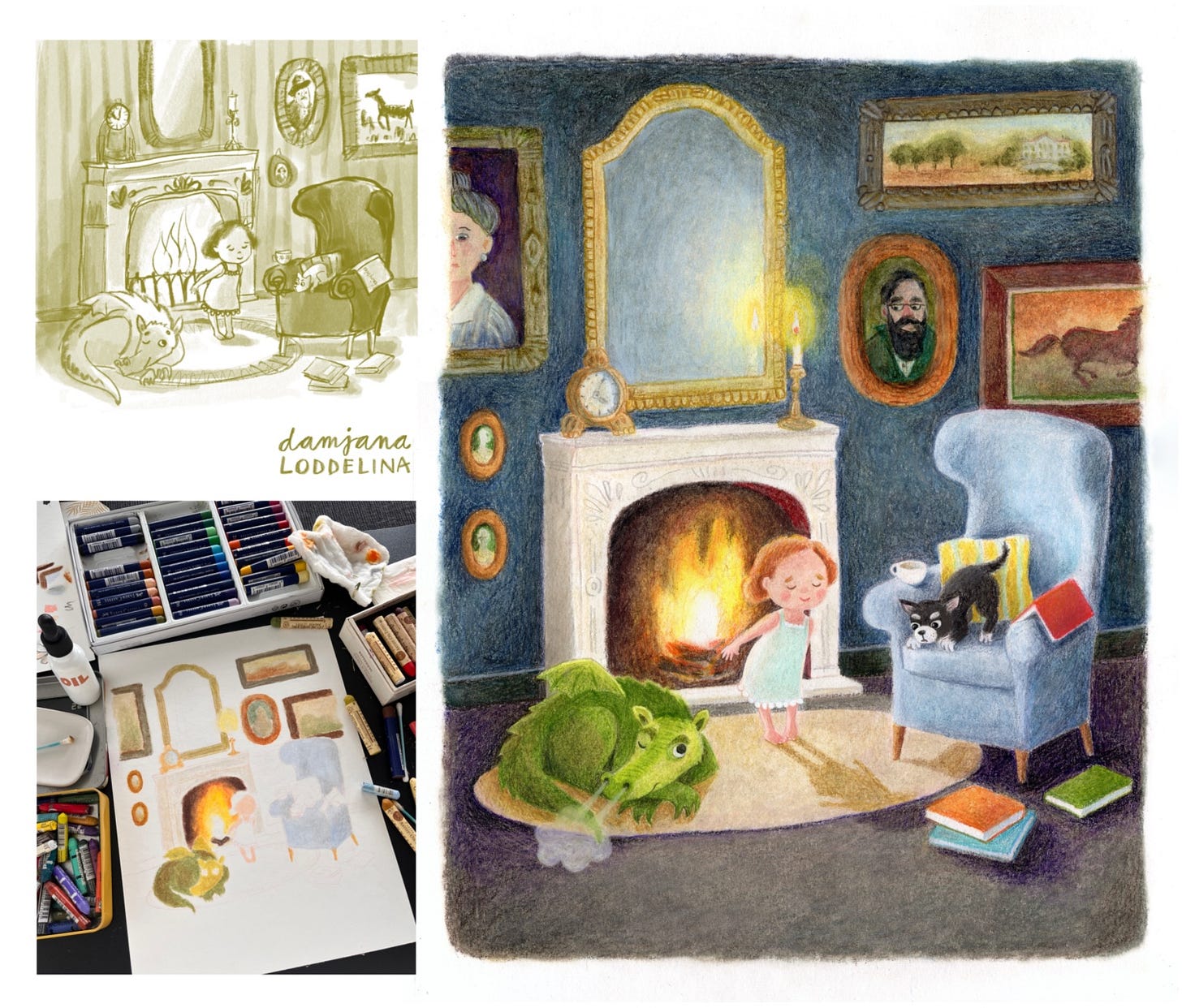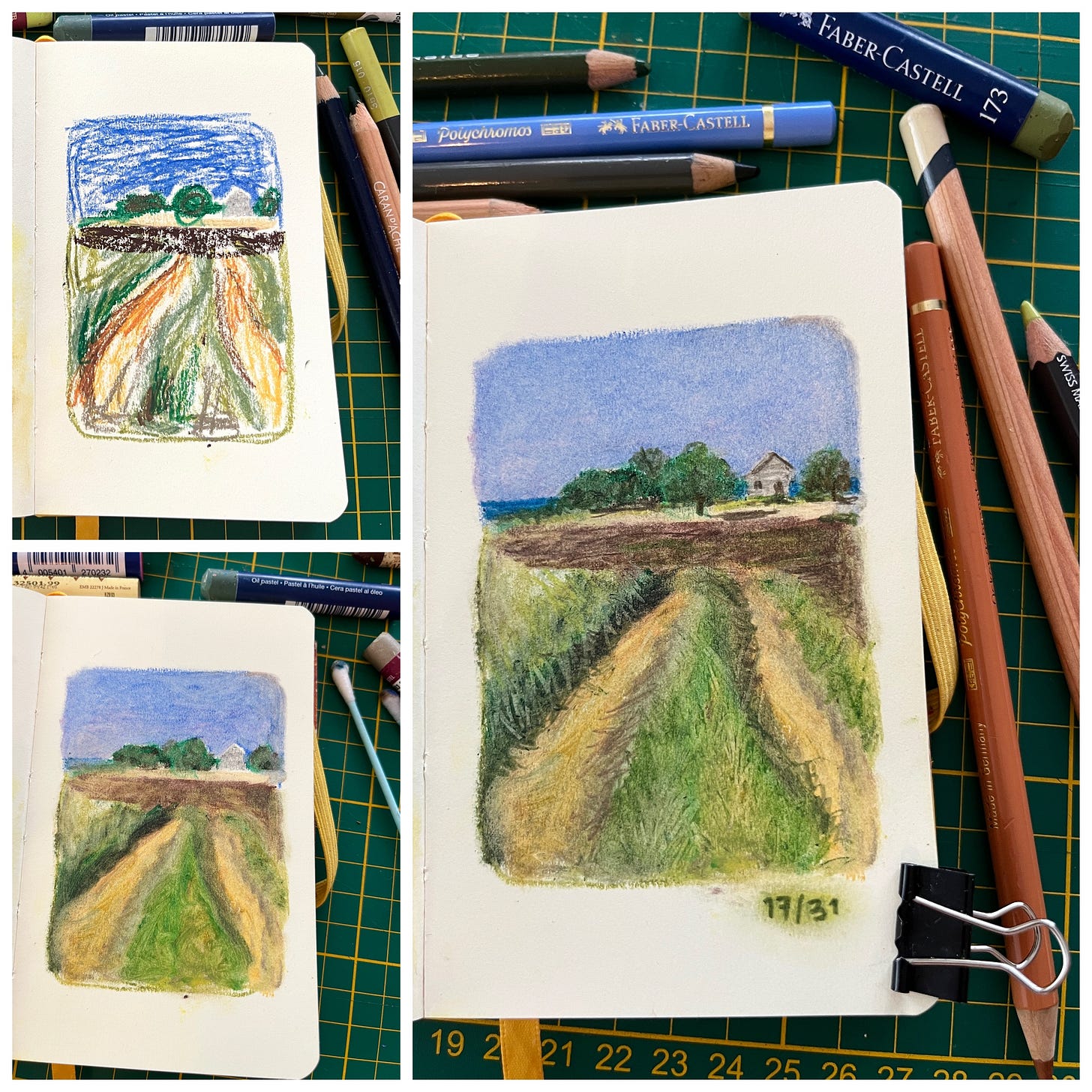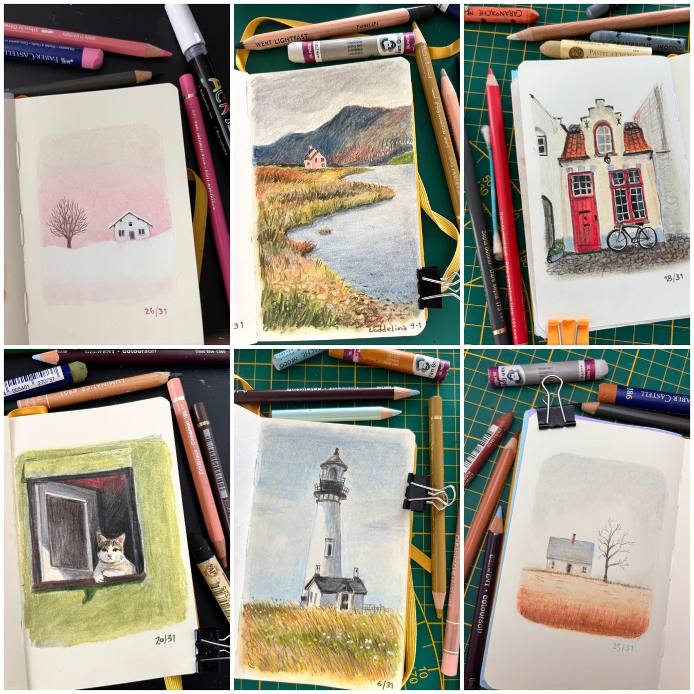 The reason why I’m so late is your wonderful, overwhelming response to my January sketchbook practice! I decided to take part in 31 Days of Creative Practice challenge, picking a simple theme of cozy houses and landscapes to draw every day for 31 days straight. I took my smallest sketchbook (it’s always easier to commit to a tiny format) and used dry media (colour pencils, oil pastels and Neocolor crayons) with mineral oil for smudging and blending.