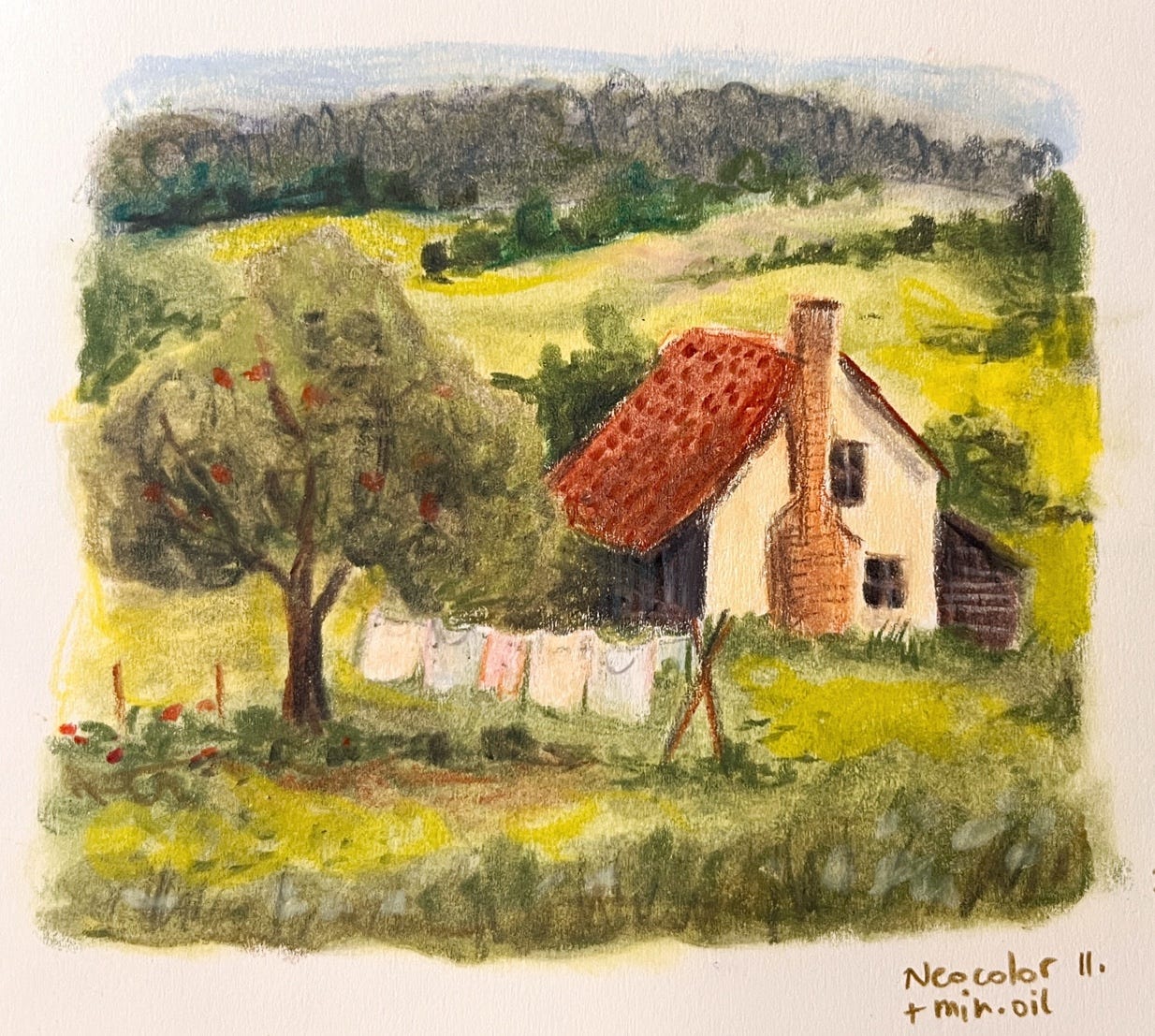 When I draw digitally, I often tend to overwork my illustrations, going too much into details and always correcting imperfections. By using these less precise tools I saw my drawings become more confident and I started to appreciate the little “accidents” that had so much character. As additional exercise I drew a landscape using only Neocolors, no sharp pencils, and this was the result (the drawing below measures about 10 x 11 cm).