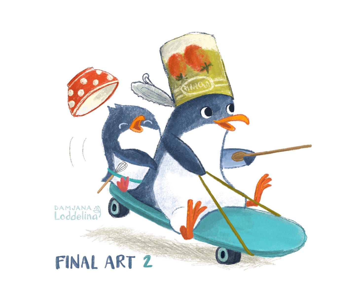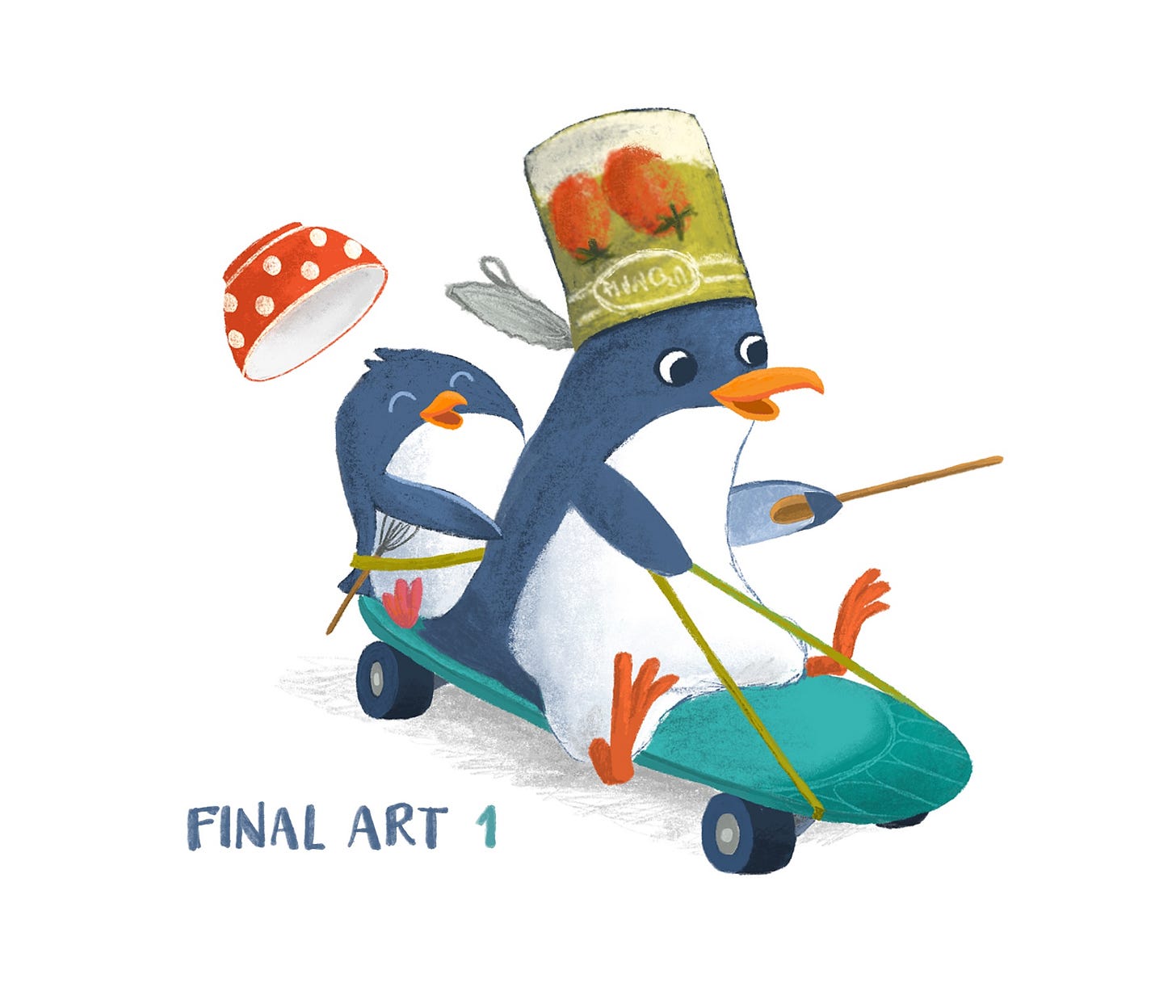 But back to my penguins, who were now turning into a couple of siblings, big brother and little sister, playing together. Here’s one little scene, sketched out with some added colour to test the final palette and see what goes well with “penguin grayish blue”…