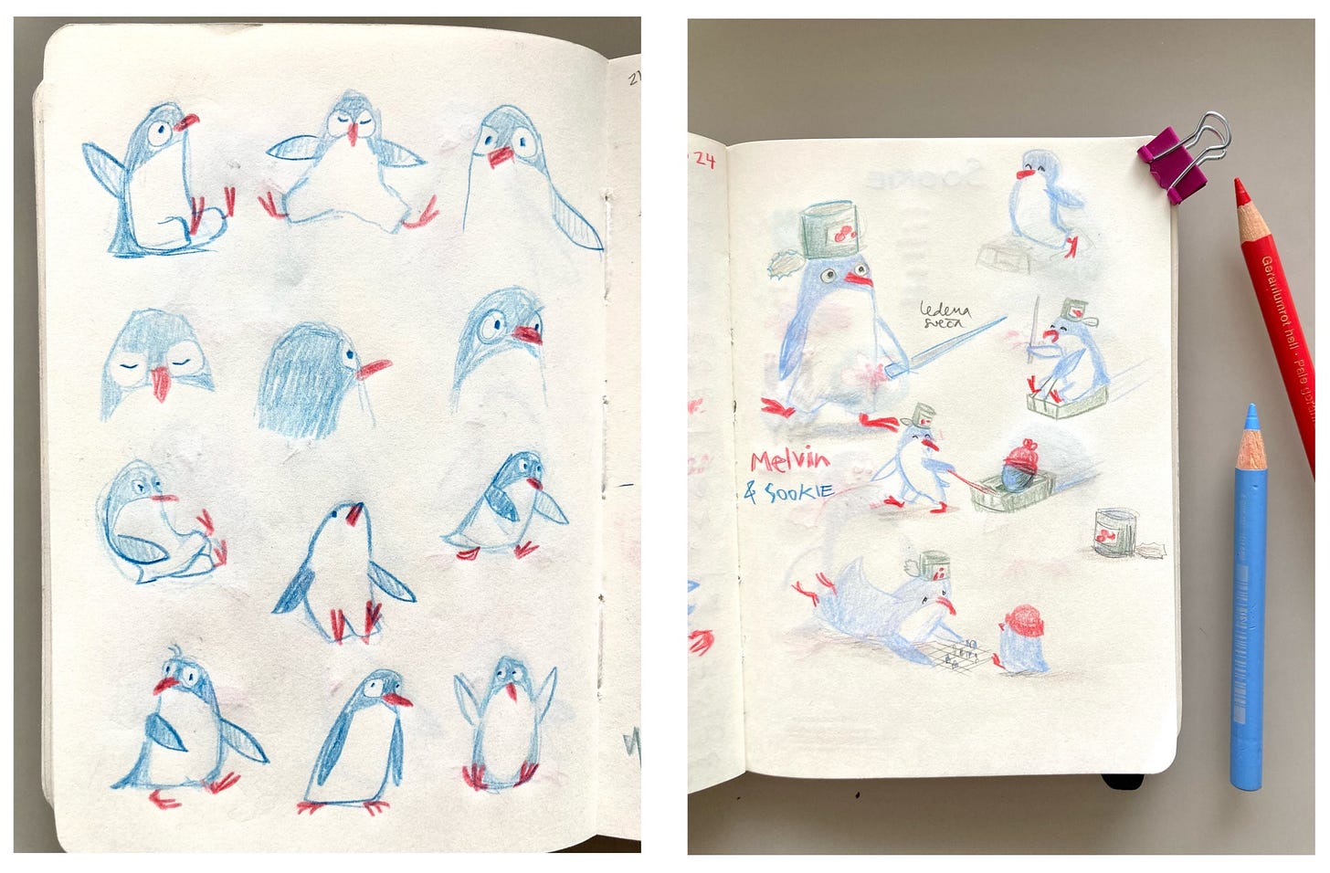 Then I tried simplifying these, drawing more loosely, from memory, to create a picture book character penguin. I like to sketch in pencil or coloured pencil, using inexpensive sketchbooks, just loosely drawing without worrying about the final result, that’s when most spontaneous results happen.