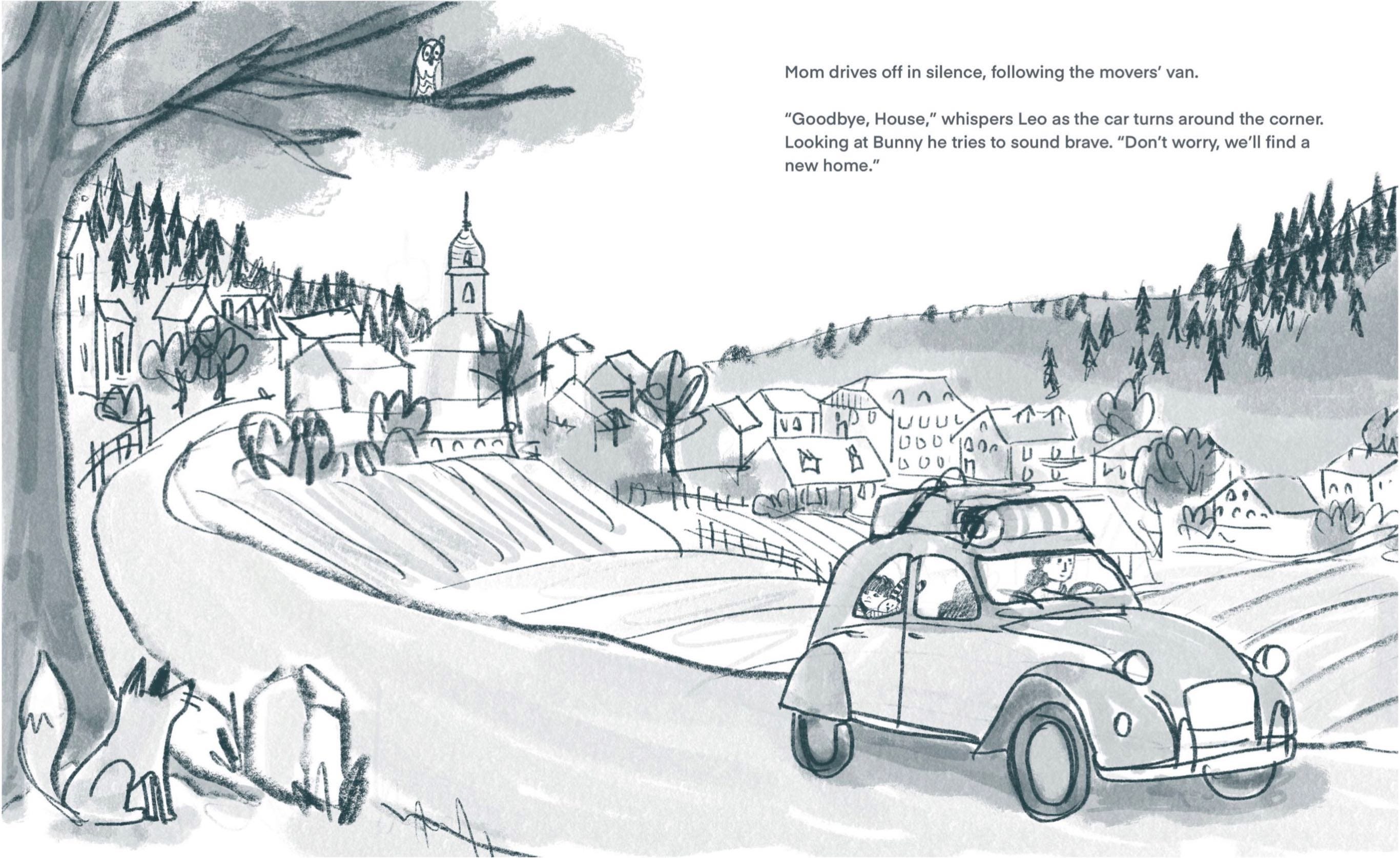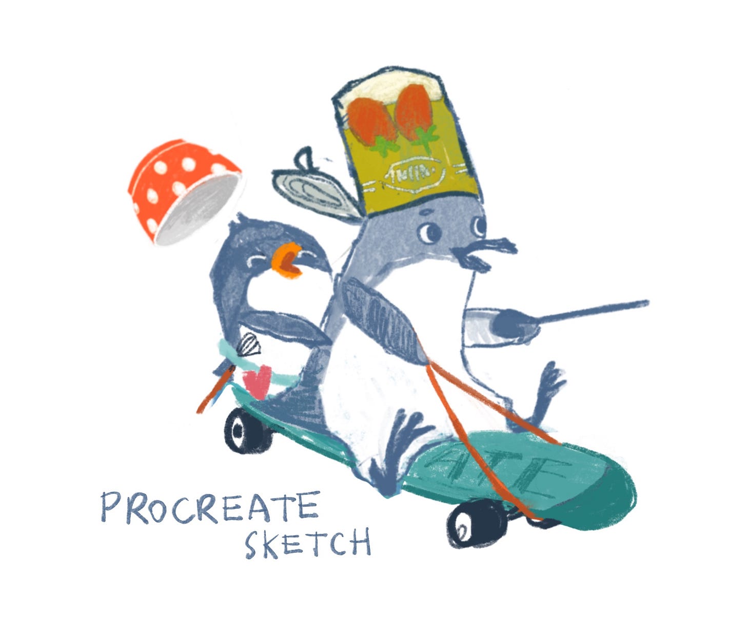 In the next stage I brought paper sketches into Procreate (I just took pictures of sketchbook spreads with my iPad and used whichever drawing I found most interesting). To imitate paper sketchbook I like to use simple, organic looking brushes, mostly 6B pencil and gloaming brush from the basic Procreate brush sets. 6B pencil is great for outlining and I use smudgy gloaming brush for quickly colouring in the shapes. This is also how I draw rough sketches for picture dummies (below is a book dummy spread from my author PB Goodbye, house)