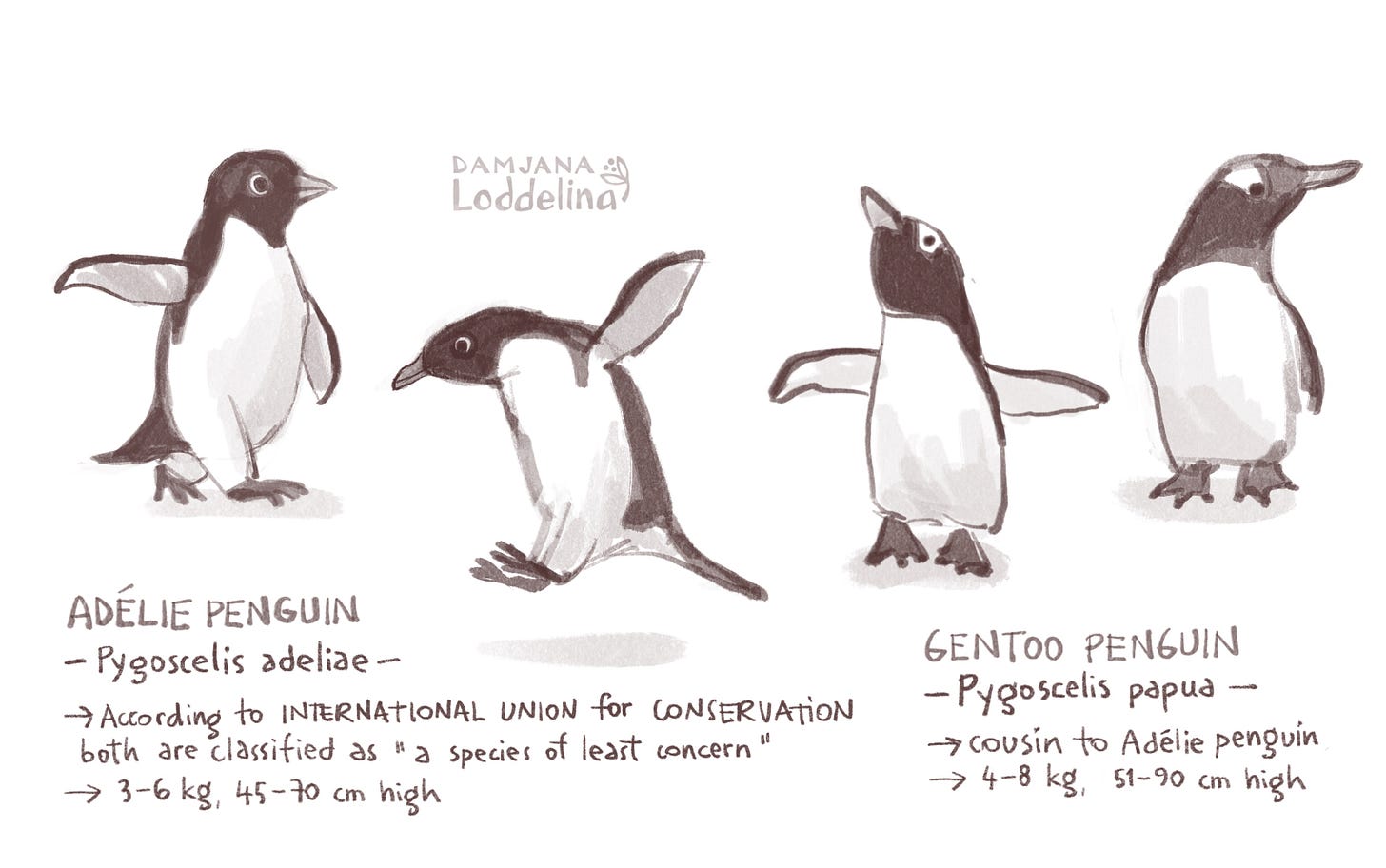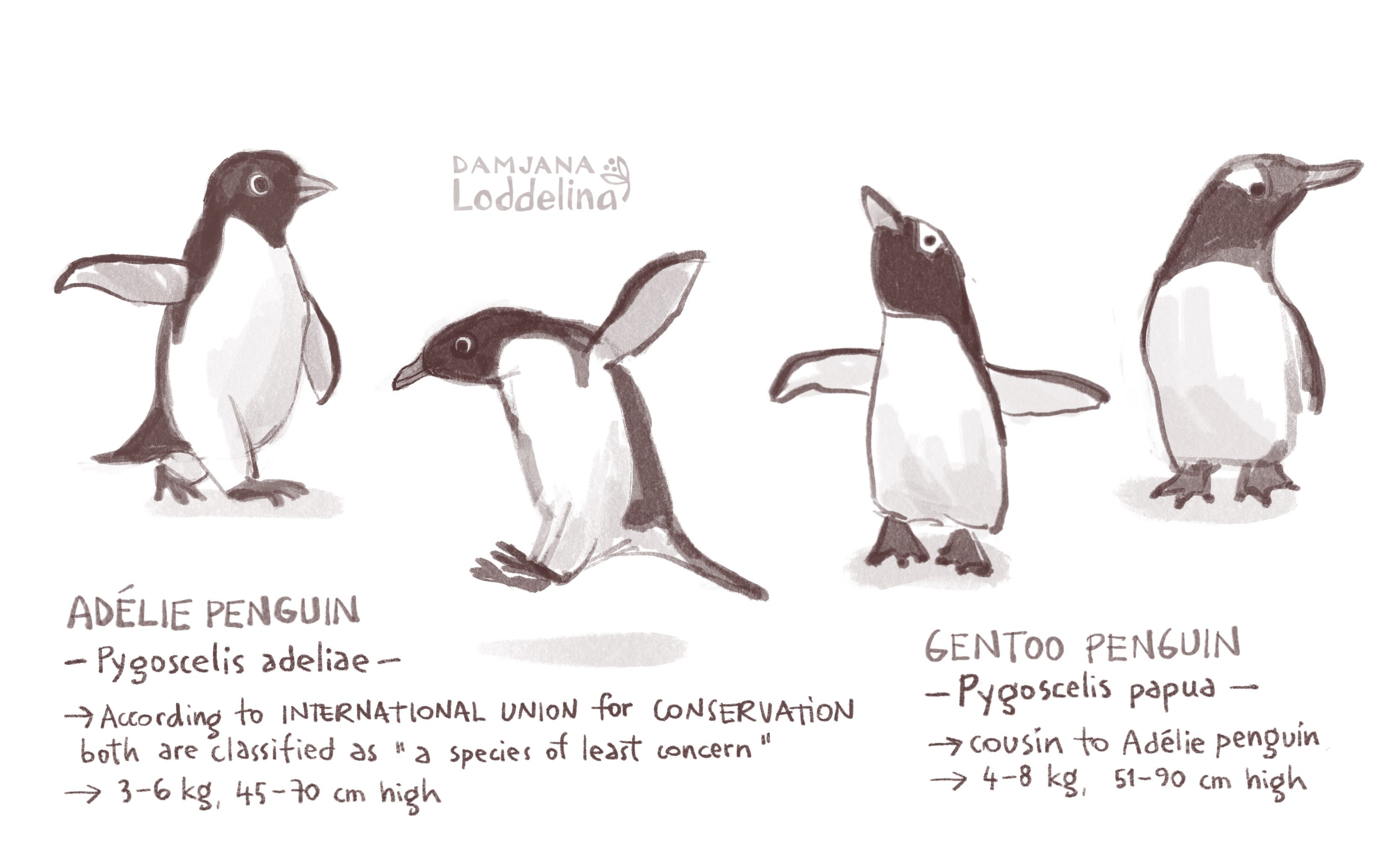 I’ve been working on some penguin characters for my portfolio and a possible picture book idea. I started by researching different penguin species and their specific characteristics and decided on these two cousin types, Adélie and Gentoo penguin. First I made some realistic sketches following photo references.